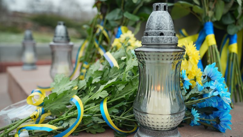 Свічки та жовто-сині квіти у підніжжя меморіалу Героїв Небесної Сотні. Суспільне Запоріжжя