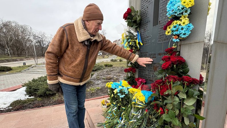 Петро Синенко показує на ім’я свого сина, викарбуване на меморіалі Героям Небесної Сотні. Суспільне Запоріжжя