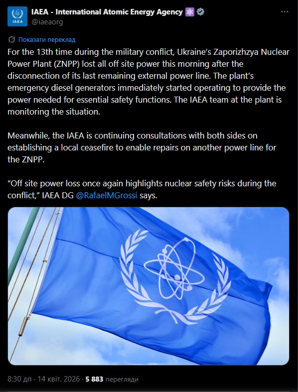 «Втрата зовнішнього електропостачання вкотре підкреслює ризики для ядерної безпеки під час конфлікту», — заявив генеральний директор організації Рафаель Гроссі.